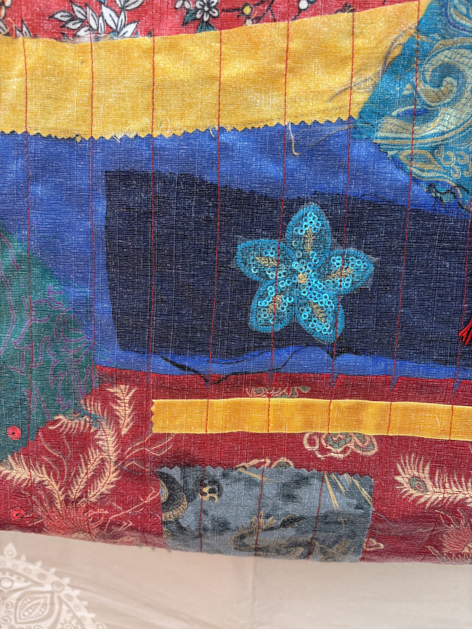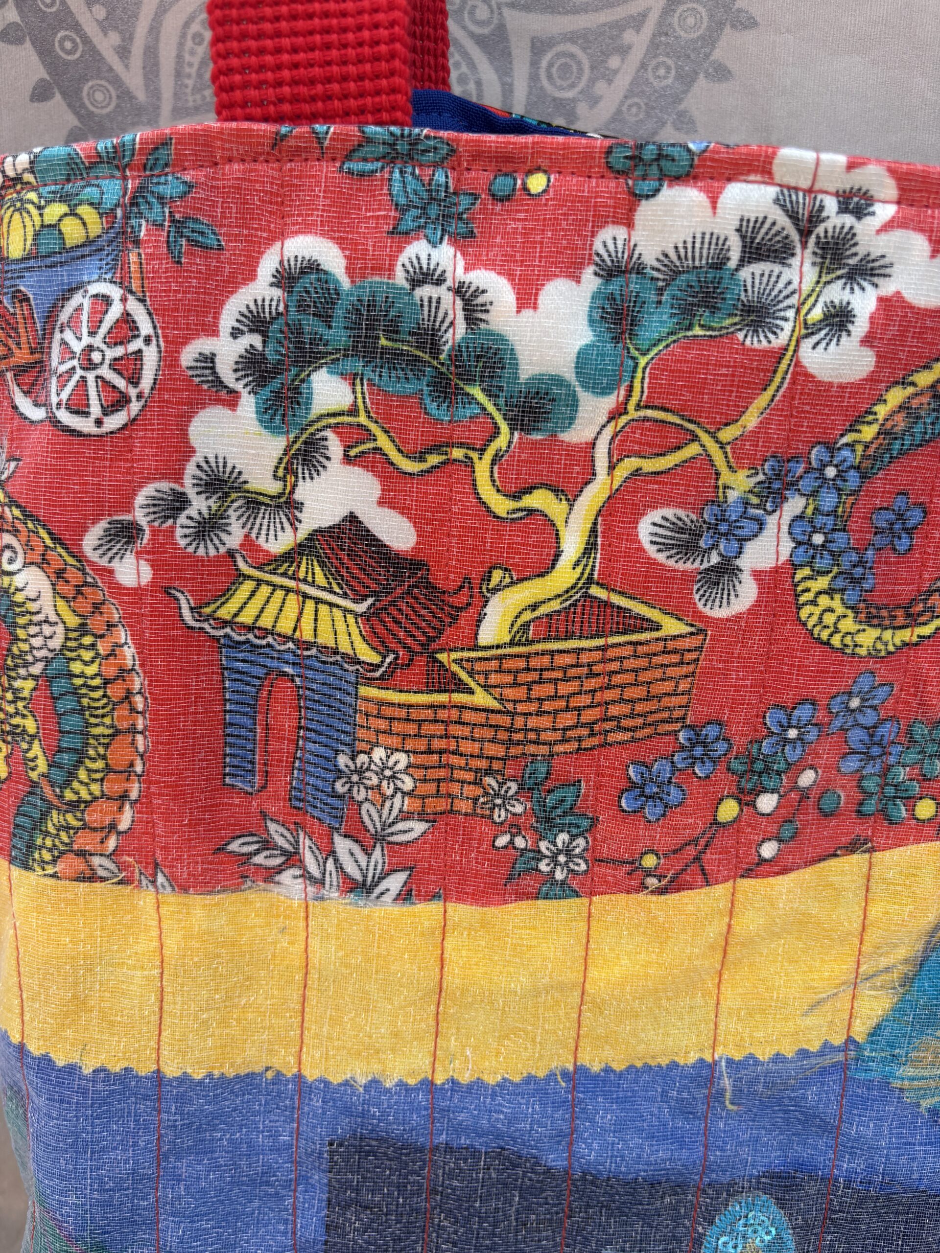 A Handmade Scrappy Art Tote Bag made with oriental pre loved and recycled fabric.