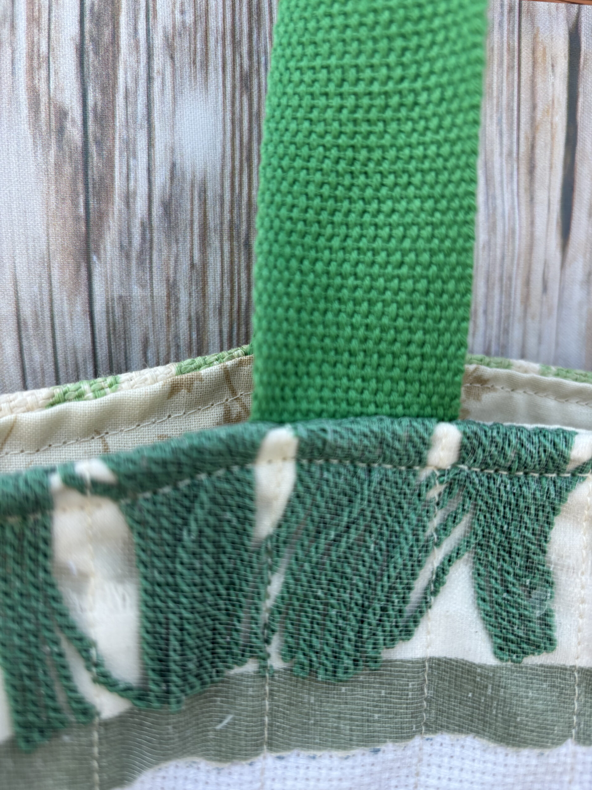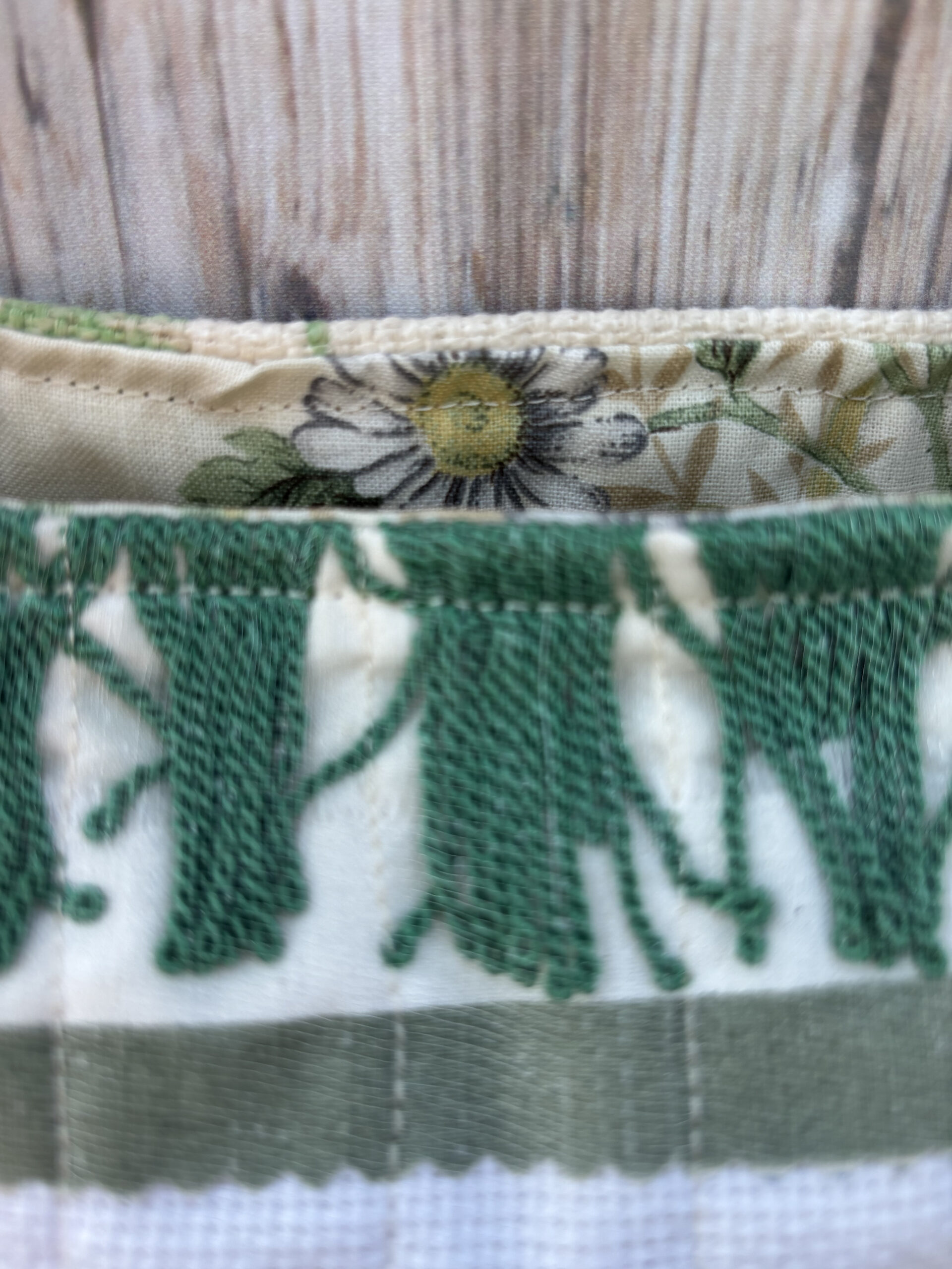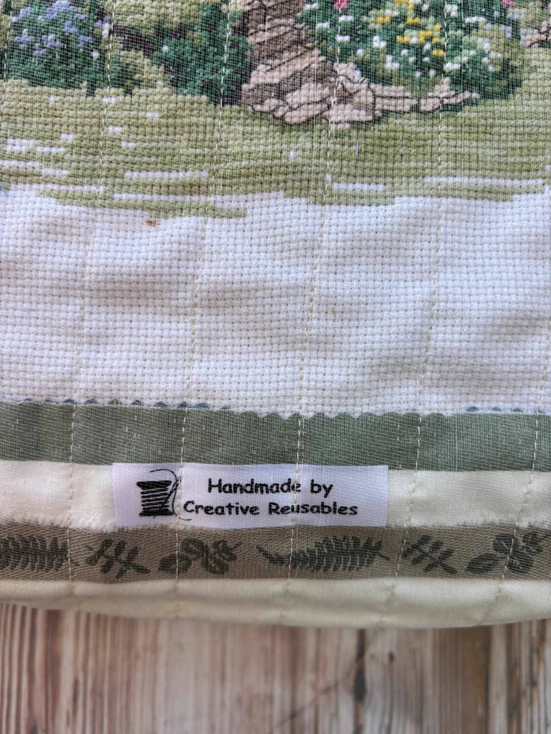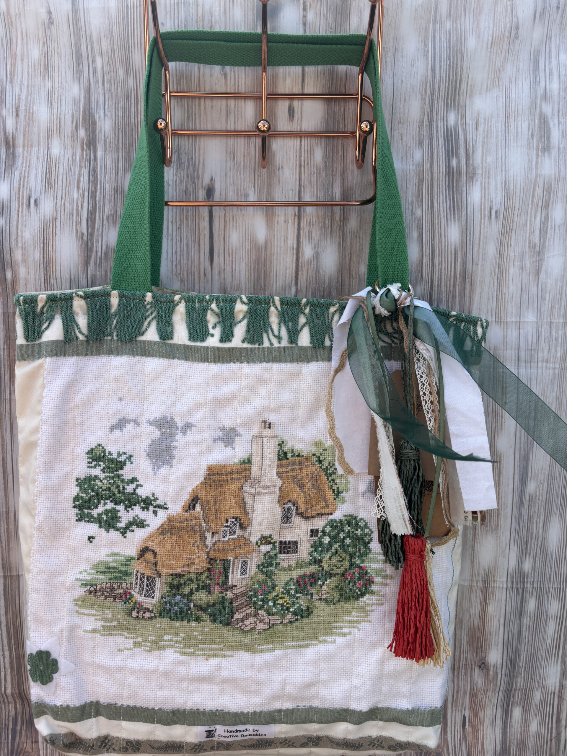 A beautiful one of a kind Scrappy Art Tote bag made with a vintage cross stitch,
